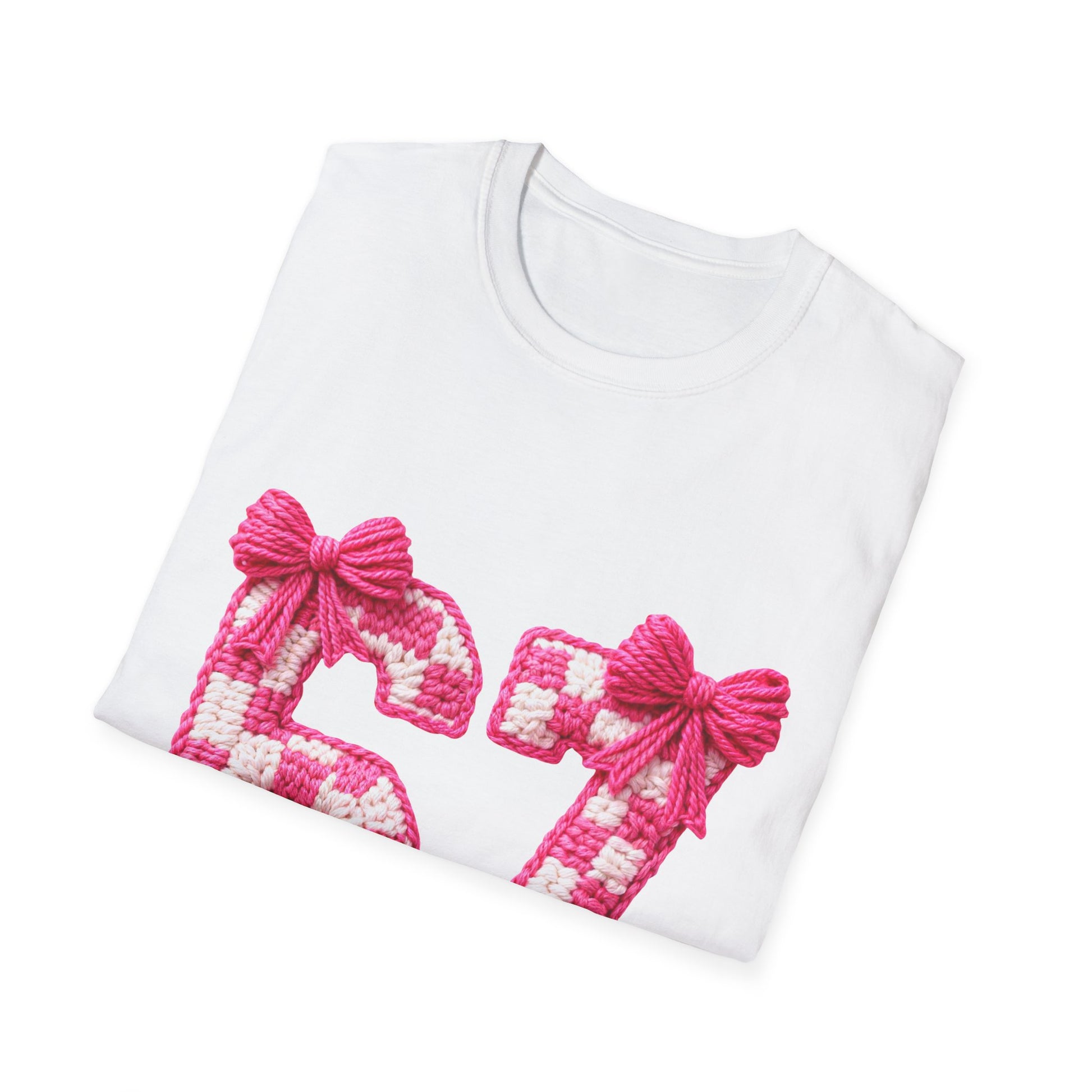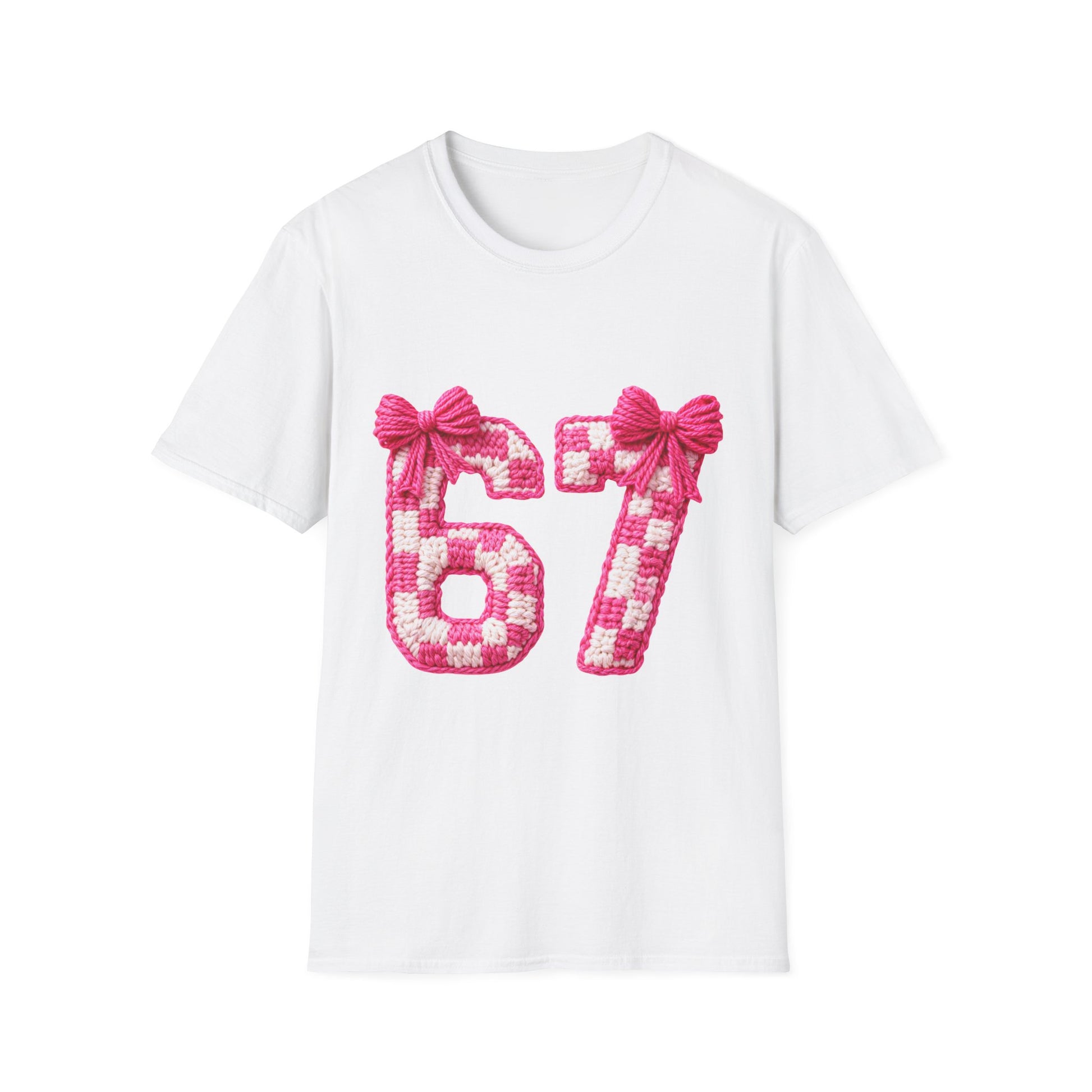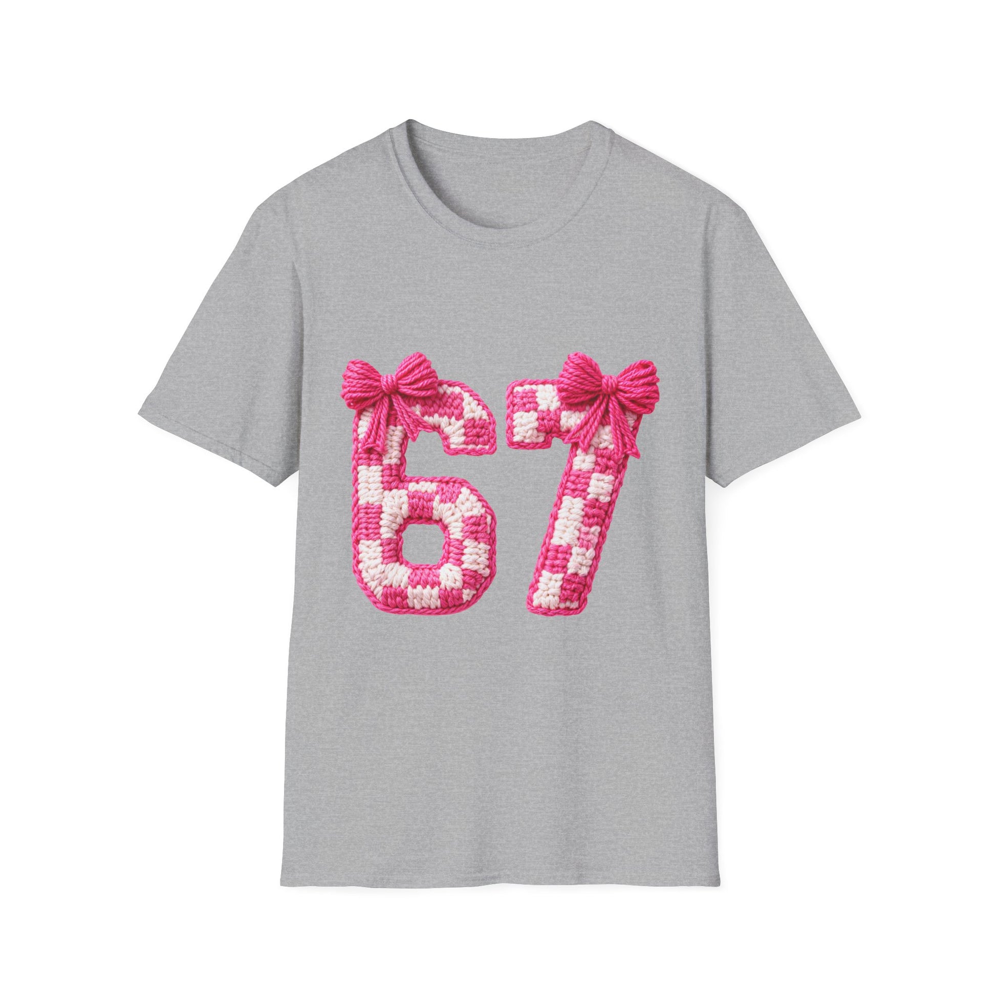 67 Pink Plaid Number T-Shirt — Cute Bow Graphic Tee for Milestone Birthdays